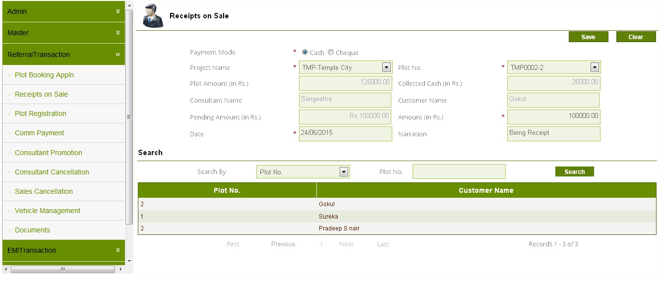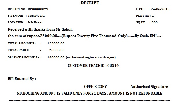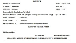 Reciept on Sale | Through this form the employee can record cash received for sale of plot and give a printed receipt |
