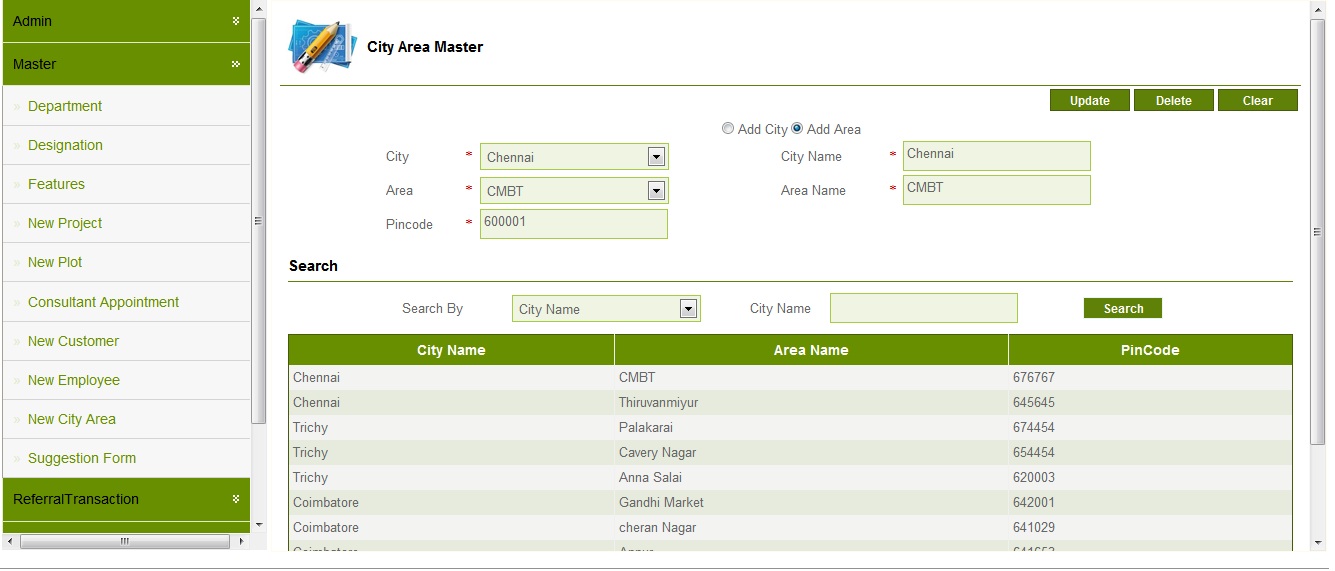 New City Area | The management can add City and Area. These are master entries and used in different screens |